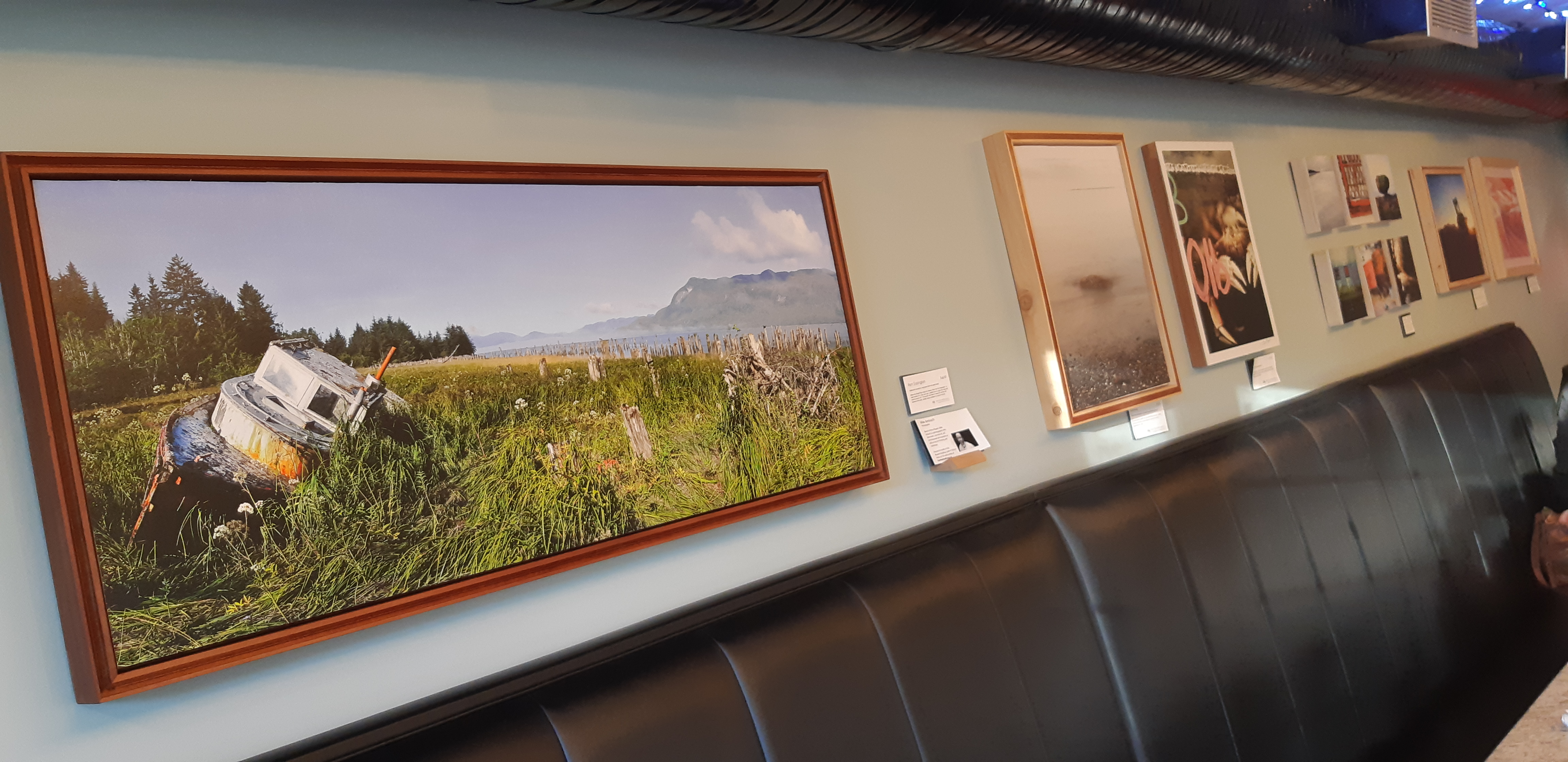 Well, not only crabs. Dreamy crabpots, retired little tugboats from Haida Gwaii, North Pacific Cannery window dressing, serene seascapes looking out to Tugwell Island, a panoramic image of old Port Essington across the Skeena, and others. If you’ve been to Dolly’s in the past few months you’ve probably seen my photos along one wall.